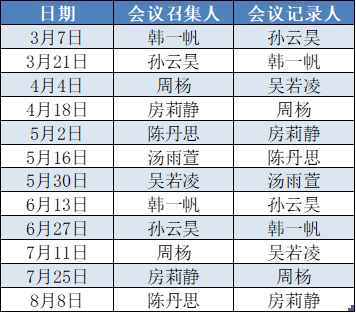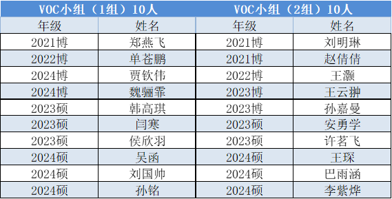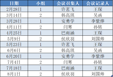 备注: 一、以上组会时间根据每两周一次的开会频率确定,每次组会的会议主席请提前和老师同学们确定最终组会时间,提前预约会议室,并在群内发布组会通知(包括组会时间,地点及汇报名单),组会当天提前到场调试好会议设备。             二、各小组名单