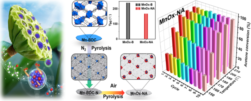 构建富氧空位的超细MnOx催化剂,提升氧物种吸附活化能力,实现VOCs的低温高效氧化。(第一作者, Environmental Science & Technology, 2021, 55: 5403-5411)